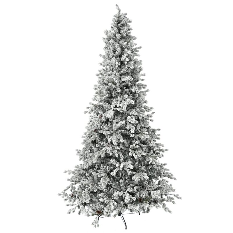 Χιονισμένο στενό δέντρο WINTER FANTASY τύπου slim με κουκουνάρες. Το ύψος του είναι 2.70 μέτρα και η διάμετρος της βάσης 145εκ.