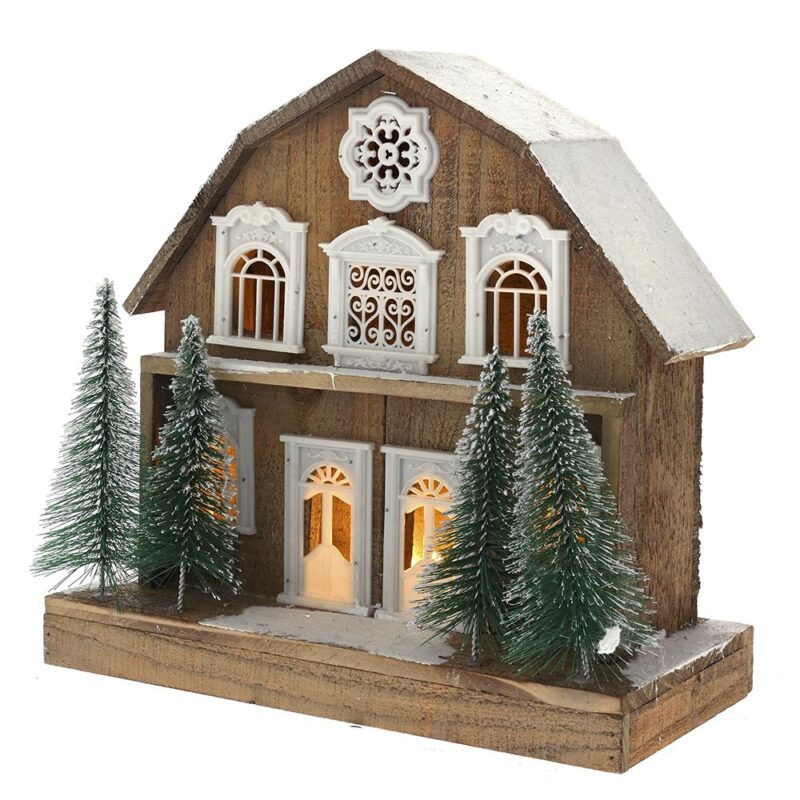 Ξύλινο Χριστουγεννιάτικο σπίτι με δεντράκια και φως. Λειτουργεί με 2 μπαταρίες ΑΑ οι οποίες δεν περιέχονται.