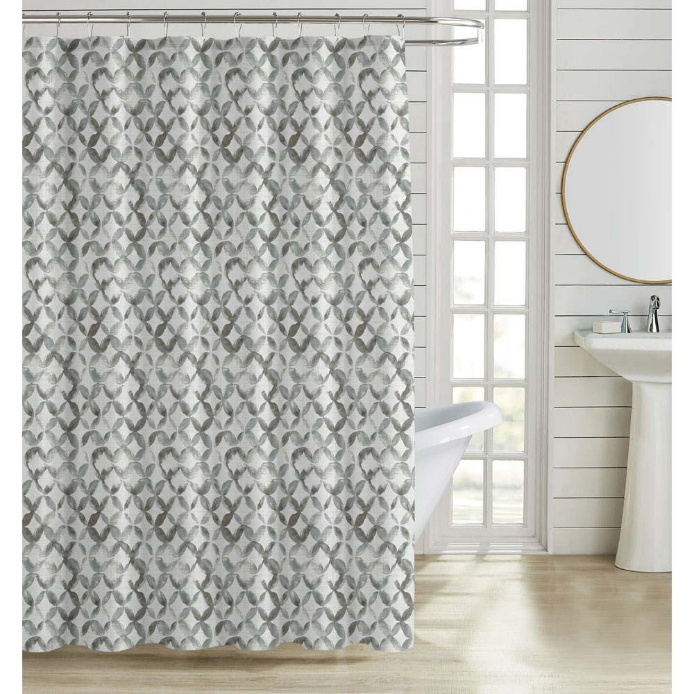Κουρτίνα πολυεστερική 90gsm, αδιάβροχη, με λευκή βάση και σχέδιο γεωμετρικό μοτίβο σε γκρι αποχρώσεις. Στην συσκευασία συμπεριλαμβάνονται δώδεκα πλαστικοί κρίκοι. Είναι εύκολη στο καθάρισμα, μαλακή και ευχάριστη αν έρθει σε επαφή με το δέρμα.