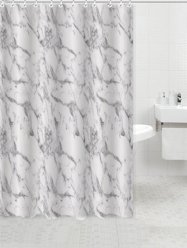 Κουρτίνα πολυεστερική 90gsm, αδιάβροχη, σε άσπρο χρώμα με διακόσμηση εφέ μάρμαρο. Στην συσκευασία συμπεριλαμβάνονται δώδεκα πλαστικοί κρίκοι. Είναι εύκολη στο καθάρισμα, μαλακή και ευχάριστη αν έρθει σε επαφή με το δέρμα.