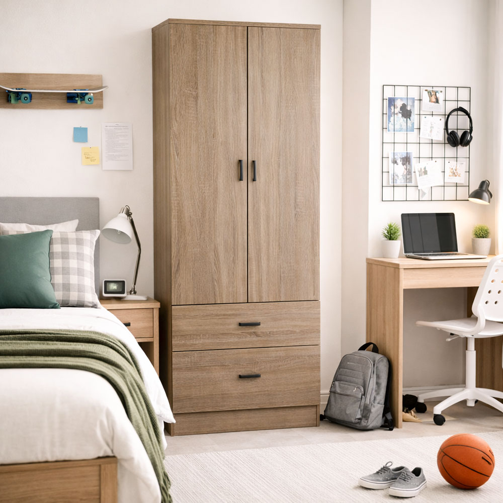 Εξαιρετικής κατασκευής, με δύο φύλλα, μεταλλική ράγα για κρεμαστά ρούχα και δύο συρτάρια. Συναρμολογούμενη σε συσκευασία KD Ξύλινα έπιπλα κομψού και μοντέρνου σχεδιασμού ιδανικά για κάθε χώρο. Αποτελούν πρακτική λύση για κάθε σπίτι καθώς ταιριάζουν σε κάθε στυλ διακόσμησης. Ανανεώστε το σαλόνι, το γραφείο ή το υπνοδωμάτιο εύκολα και οικονομικά. Επιλέξτε το χρώμα και το σχέδιο που ταιριάζει απόλυτα στον χώρο σας.