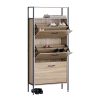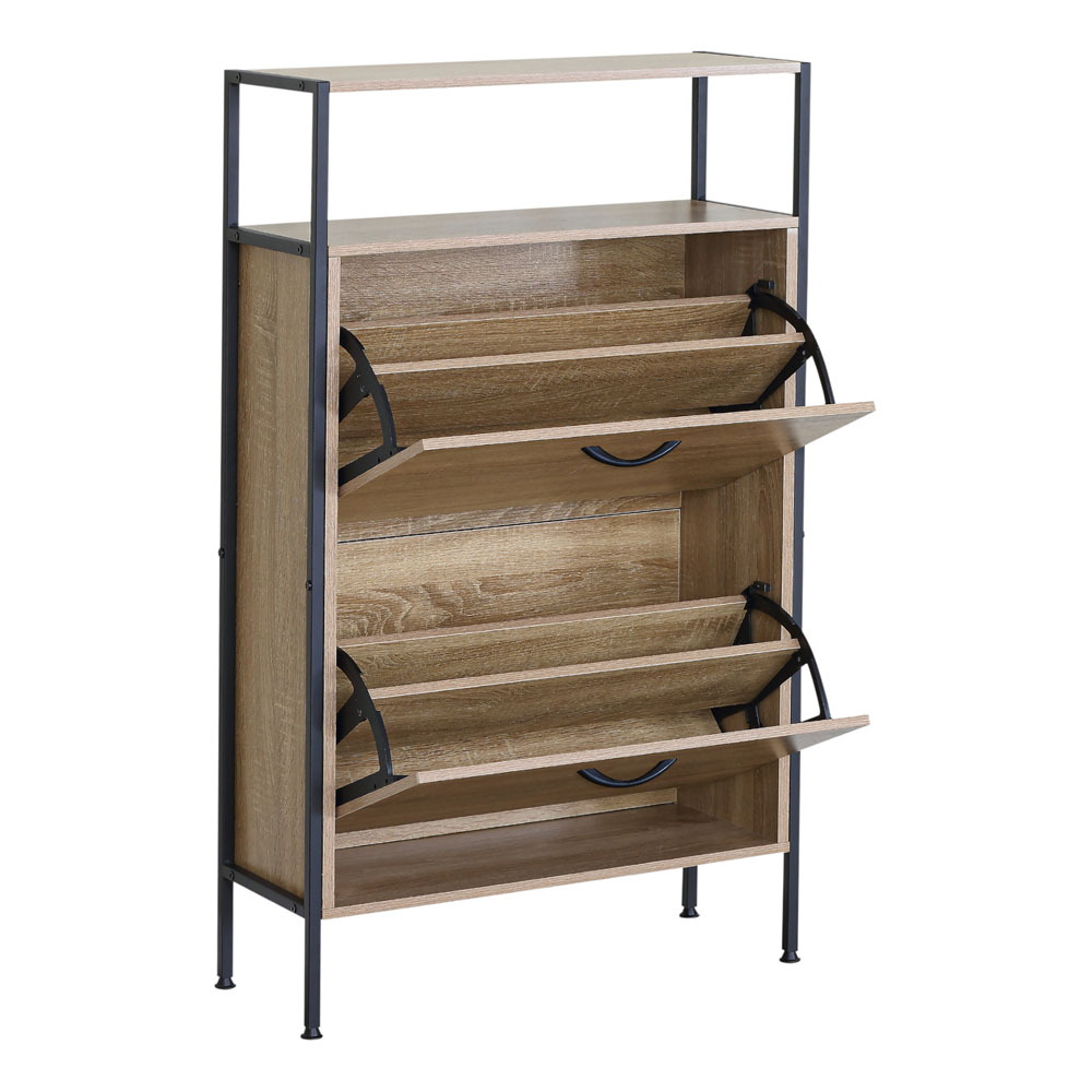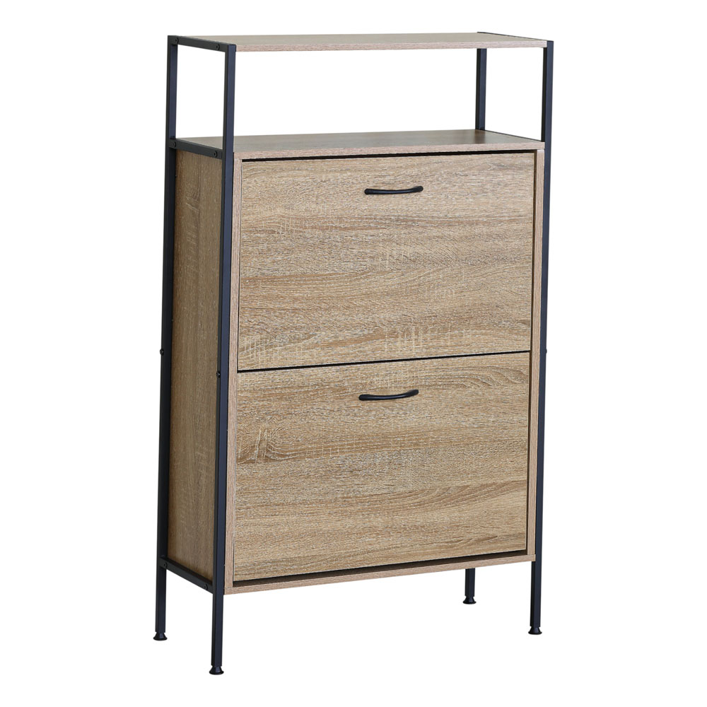 Παπουτσοθήκη ξύλινη με 2 ανακλινόμενα πορτάκια και μαύρο μεταλλικό σκελετό, ιδανική για είσοδο, διάδρομο ή υπνοδωμάτιο, εξοικονομεί χώρο και κρατάει τα παπούτσια σας τακτοποιημένα. Η κατασκευή της εξασφαλίζει σταθερότητα και αντοχή.