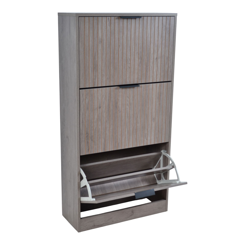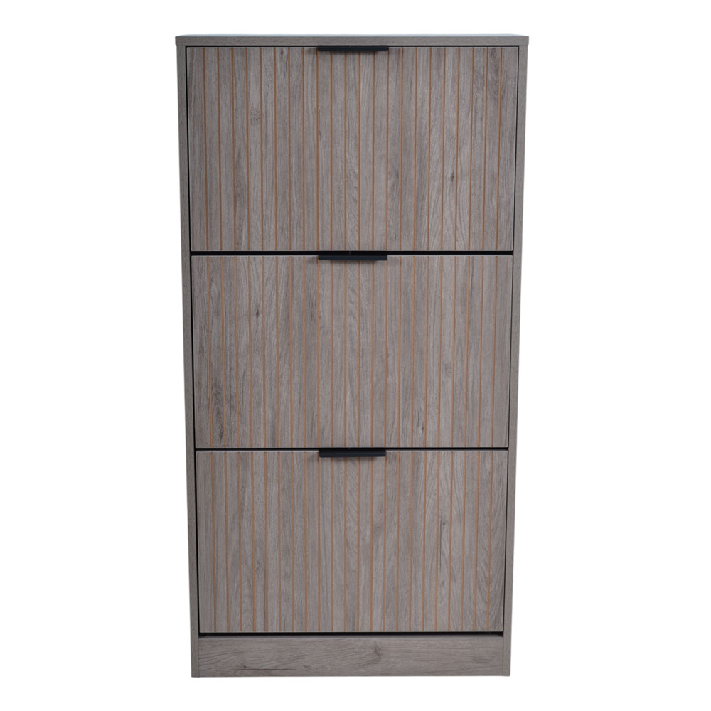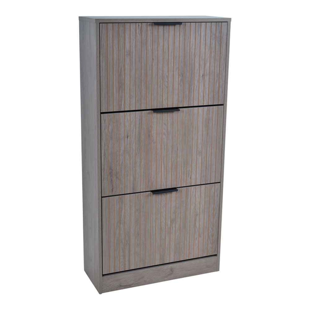 Παπουτσοθήκη από MDF με επένδυση μελαμίνης σε γκρι απόχρωση φυσικού ξύλου. Διαθέτει ανακλινόμενες πόρτες για εύκολη πρόσβαση και εξοικονόμηση χώρου, με όψη φυσικού ξύλου και κάθετες ανάγλυφες γραμμές που προσδίδουν μοντέρνο χαρακτήρα. Τα μαύρα μεταλλικά πόμολα συμπληρώνουν τον σχεδιασμό, προσφέροντας κομψή αντίθεση και πρακτικότητα. Η στιβαρή κατασκευή από MDF εξασφαλίζει αντοχή στην καθημερινή χρήση, ενώ η μελαμίνη καθιστά την επιφάνεια εύκολη στο καθάρισμα.