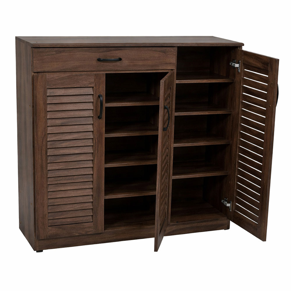 Ξύλινη παπουτσοθήκη με μοντέρνο και λειτουργικό σχεδιασμό, ιδανική για την οργάνωση υποδημάτων σε κάθε χώρο. Διαθέτει ευρύχωρους εσωτερικούς χώρους μήκους 67 εκ. και βάθους 35 εκ., προσφέροντας άνετη αποθήκευση για πολλά ζευγάρια παπουτσιών. Περιλαμβάνει πολλαπλά ράφια για σωστή οργάνωση, ενώ παρέχει τη δυνατότητα αφαίρεσης δύο ραφιών, ώστε να δημιουργηθεί επιπλέον ύψος για την αποθήκευση ψηλών υποδημάτων, όπως μπότες. Το επάνω συρτάρι είναι ιδανικό για μικροαντικείμενα, προσφέροντας επιπλέον πρακτικότητα.