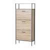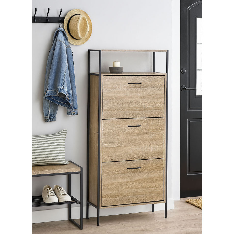 Παπουτσοθήκη ξύλινη με 3 ανακλινόμενα πορτάκια και μαύρο μεταλλικό σκελετό, ιδανική για είσοδο, διάδρομο ή υπνοδωμάτιο, εξοικονομεί χώρο και κρατάει τα παπούτσια σας τακτοποιημένα. Η κατασκευή της εξασφαλίζει σταθερότητα και αντοχή.
