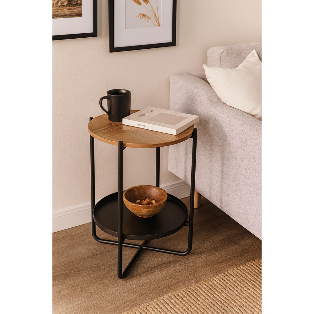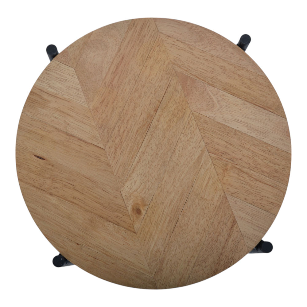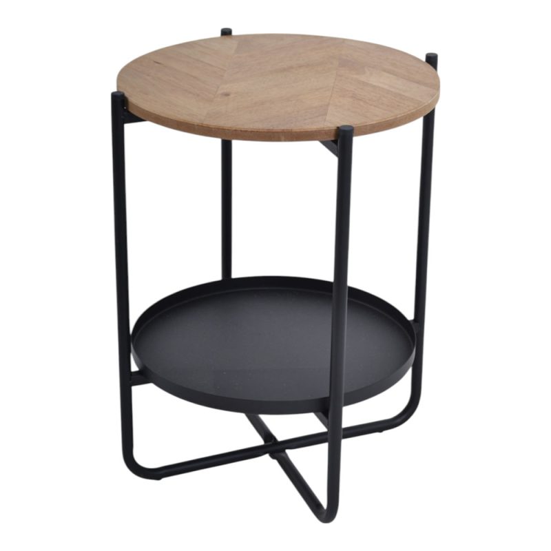 Βοηθητικό τραπεζάκι στρογγυλό με μοντέρνο σχεδιασμό. Διαθέτει επιφάνεια από ξύλο με φυσική όψη σε μοτίβο ψαροκόκαλο και μαύρη μεταλλική βάση με δεύτερο ράφι για επιπλέον λειτουργικότητα. Ιδανικό για το σαλόνι, το υπνοδωμάτιο ή το γραφείο.